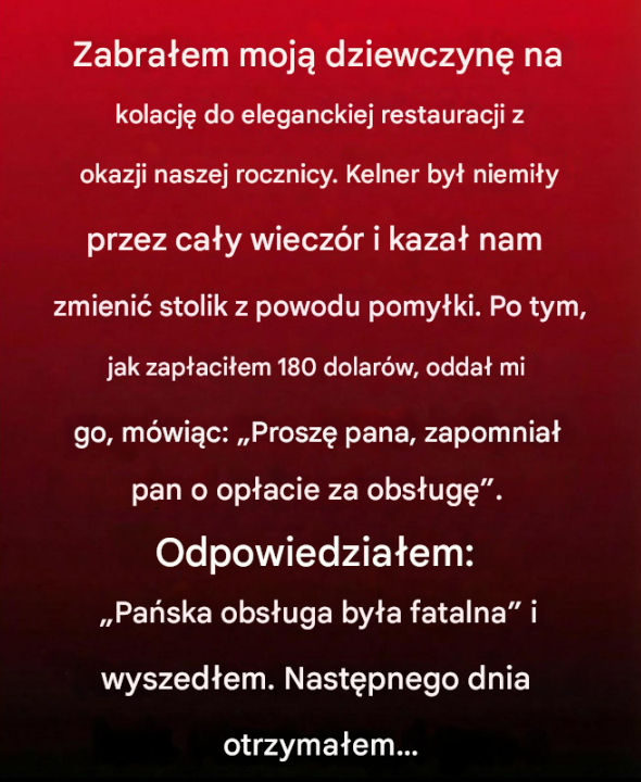 Ten wieczór miał być wyjątkowy, taki, który skrupulatnie planujesz, mając nadzieję, że pozostanie w pamięci na długo. Odkładałem pieniądze tygodniami, bez końca odtwarzałem w pamięci te rozmowy i wybrałem restaurację słynącą z dyskretnej elegancji. Przyćmione oświetlenie, nieskazitelne obrusy, lśniące kieliszki: wszystko obiecywało intymność i troskliwą obsługę. Kiedy moja dziewczyna pojawiła się uśmiechnięta i promienna, byłem pewien, że wieczór będzie dokładnie taki, jak sobie wyobrażałem.