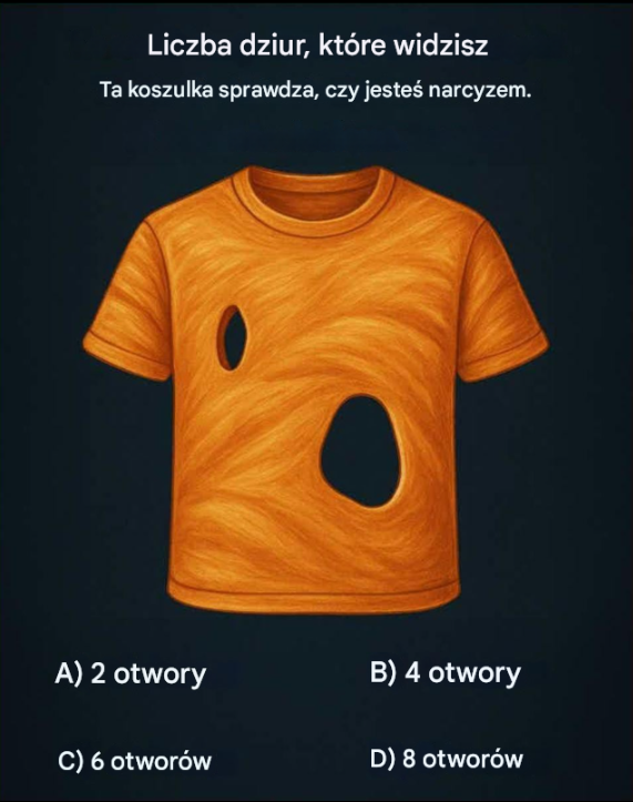 Dostrzegasz jaskrawopomarańczową koszulkę z dwoma rozdarciami z przodu. Poniżej pojawiają się cztery opcje: 2, 4, 6 lub 8 dziurek, którym towarzyszy ironiczny nagłówek: „Liczba dziurek, które widzisz na tej koszulce, decyduje o tym, czy jesteś narcyzem”. Zanim cię osądzę, potraktuj to jako zabawną i łatwą do podzielenia się zagadkę, która mówi więcej o twoim nastawieniu niż o zdrowiu psychicznym.