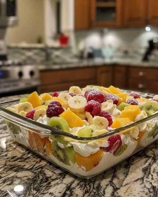 3. Dodaj odsączonego, rozgniecionego ananasa, pokrojone truskawki i mandarynki do kremowej mieszanki. Wymieszaj, aby równomiernie połączyć owoce.