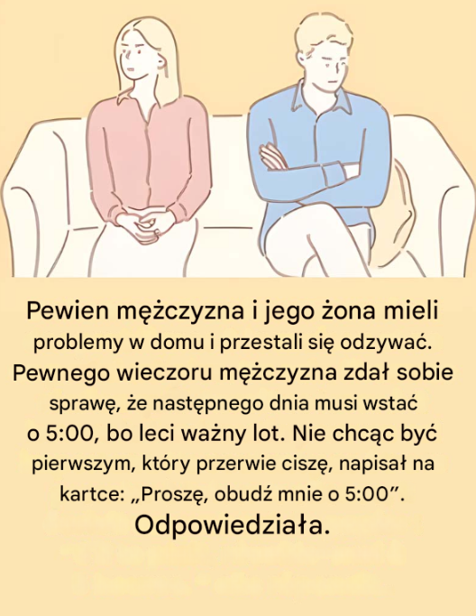 Mężczyzna, który miał lot służbowy o 5 rano, nie chciał stracić twarzy, rozmawiając z żoną. Wybrał więc pomysłowe rozwiązanie: krótką notatkę, którą strategicznie umieścił w miejscu, gdzie żona mogła ją znaleźć. Na kartce napisał po prostu: